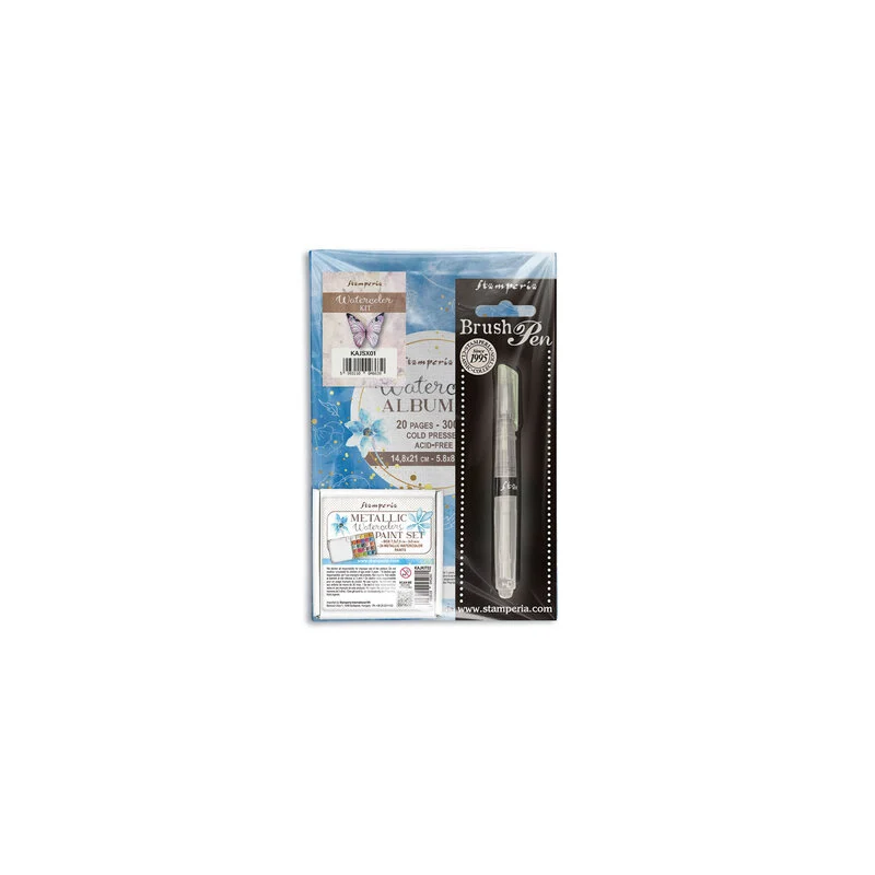 The metallic watercolor kit is perfect for adding a shimmering and elegant touch to your creative projects. It includes a selection of bright metallic watercolor paints, neatly arranged in a compact album, making it ideal for both home use and travel. A paintbrush is included so you can start painting right away.